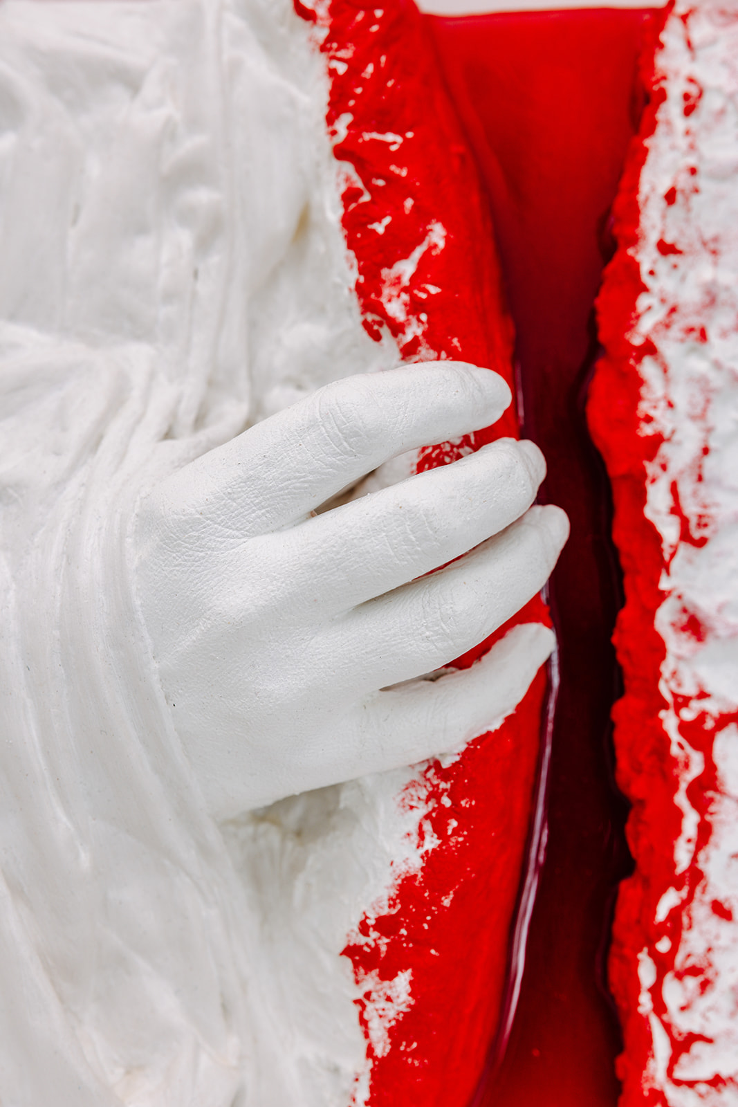 Das Hochrelief „Aufbrechen“ aus der Serie „Innerstes“ (2024) ist ein skulpturales Mixed-Media-Objekt mit ausgeprägter physischer Präsenz. Mit einer Größe von 30 x 30 cm und einer Tiefe von bis zu 8 cm überschreitet das Werk bewusst die klassische Bildfläche und tritt deutlich in den Raum. Es gibt Momente, in denen Oberfläche nicht mehr trägt. Momente, in denen etwas aufbrechen muss. „Aufbrechen“ zeigt diesen Übergang. Eine schützende, weiß modellierte Hülle wird zur Seite gedrückt. Dahinter erscheint ein intensives Rot - roh, unmittelbar, sichtbar. Die plastisch ausgearbeitete Oberfläche wirkt zunächst ruhig und kontrolliert. Doch unter dieser Schicht offenbart sich eine emotionale Spannung. Das Werk thematisiert das Sichtbarmachen innerer Prozesse, die häufig im Verborgenen bleiben.