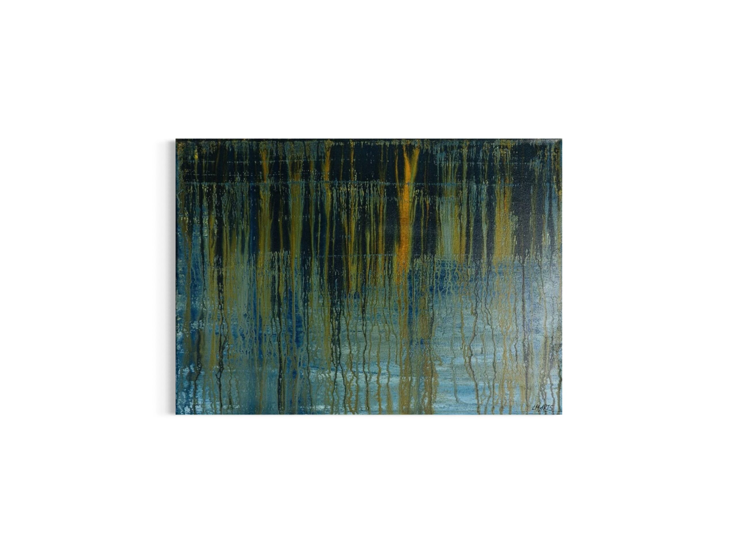 „Abschied“ ist ein leises Werk. Die vertikalen Spuren wirken wie Linien, die nach unten fließen. Wie etwas, das sich löst. Dunkle, tiefe Bereiche im oberen Teil gehen über in hellere, ruhigere Flächen. Ein Übergang - nicht abrupt, sondern langsam. Blau- und Grüntöne tragen die Grundstimmung. Goldene und gelbe Akzente durchbrechen die Fläche und setzen feine Lichtpunkte. Das Werk erzählt kein konkretes Motiv. Es beschreibt einen Zustand. Ein Moment zwischen Festhalten und Loslassen. Zwischen Schwere und Klarheit.