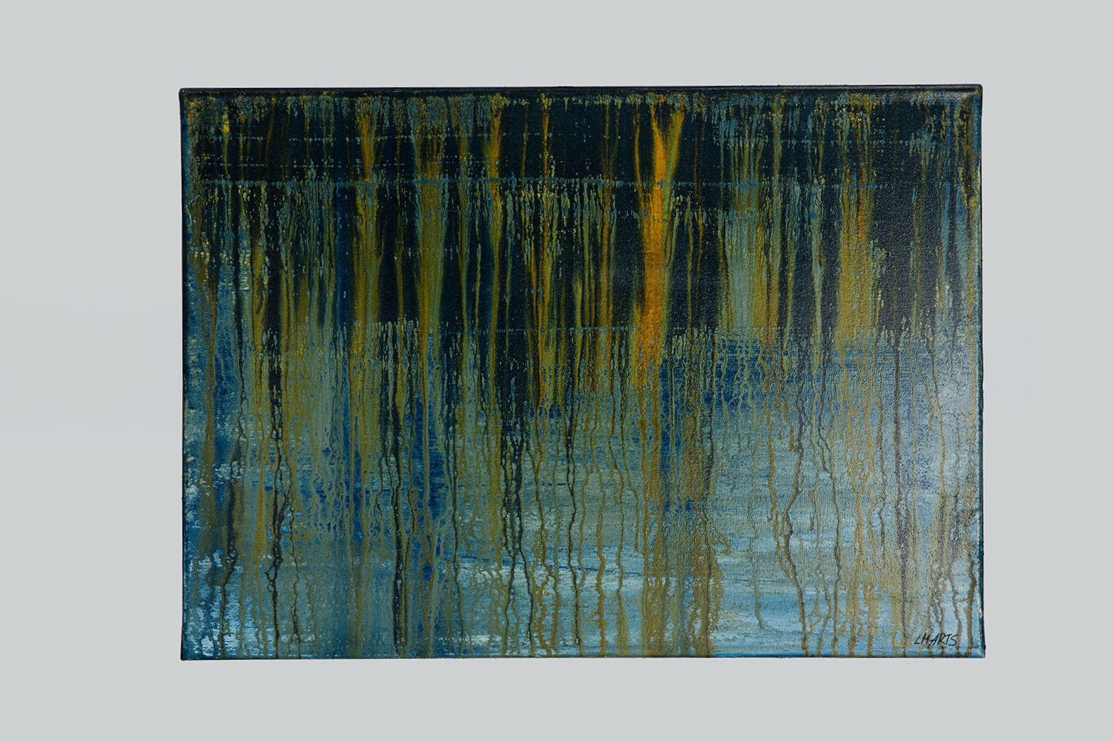 Acrylfarbe wird in fließenden Schichten aufgebaut und gezielt verlaufen gelassen. Die Struktur entsteht durch das Zusammenspiel von Farbe, Bewegung und Schichtung. Vertikale Linien bilden sich durch das bewusste Arbeiten mit fließenden Elementen. Die Oberfläche bleibt lebendig, ohne dominant zu wirken. Das glänzende Finish verstärkt die Tiefenwirkung und lässt die Goldtöne je nach Licht unterschiedlich erscheinen.