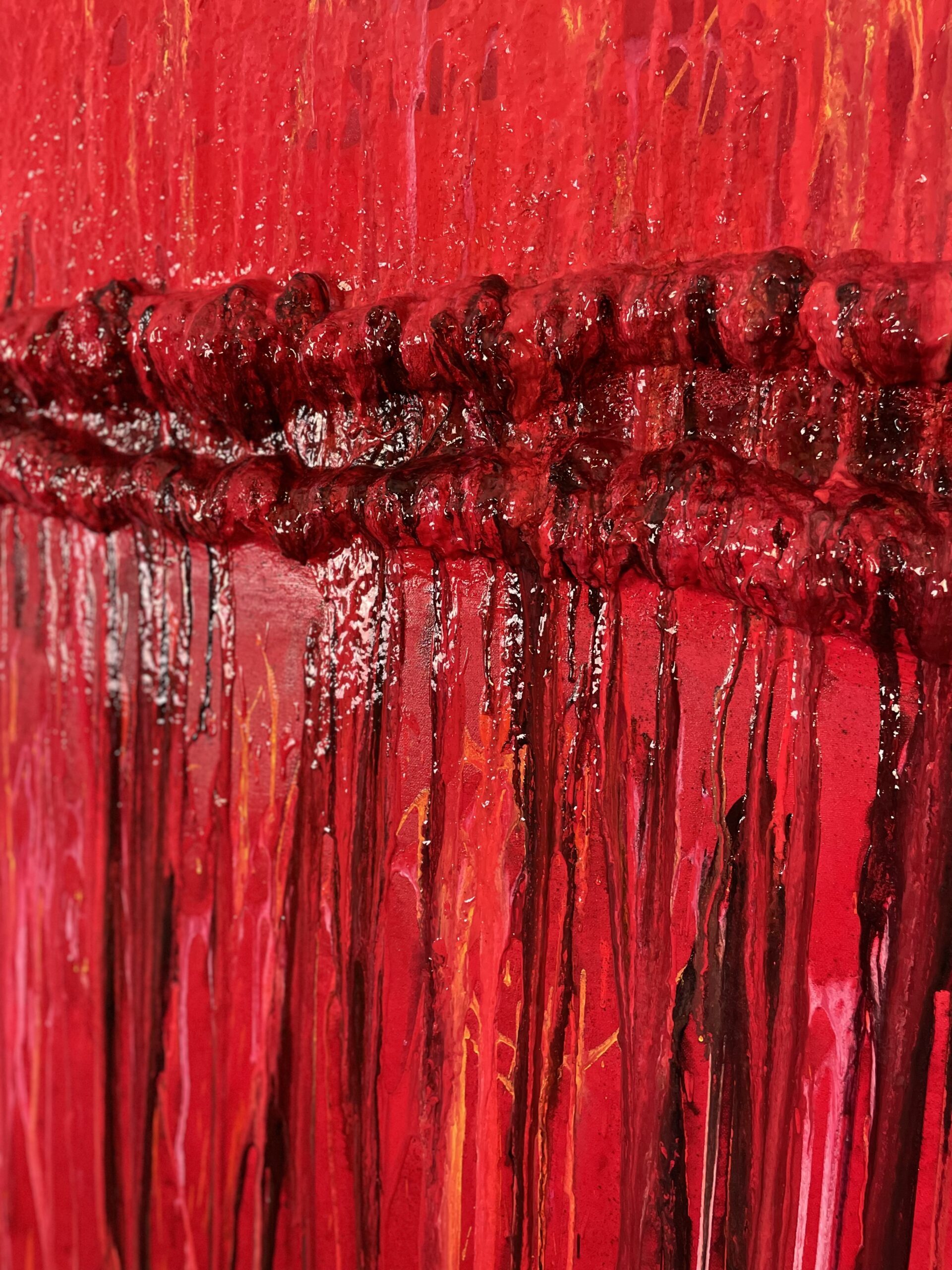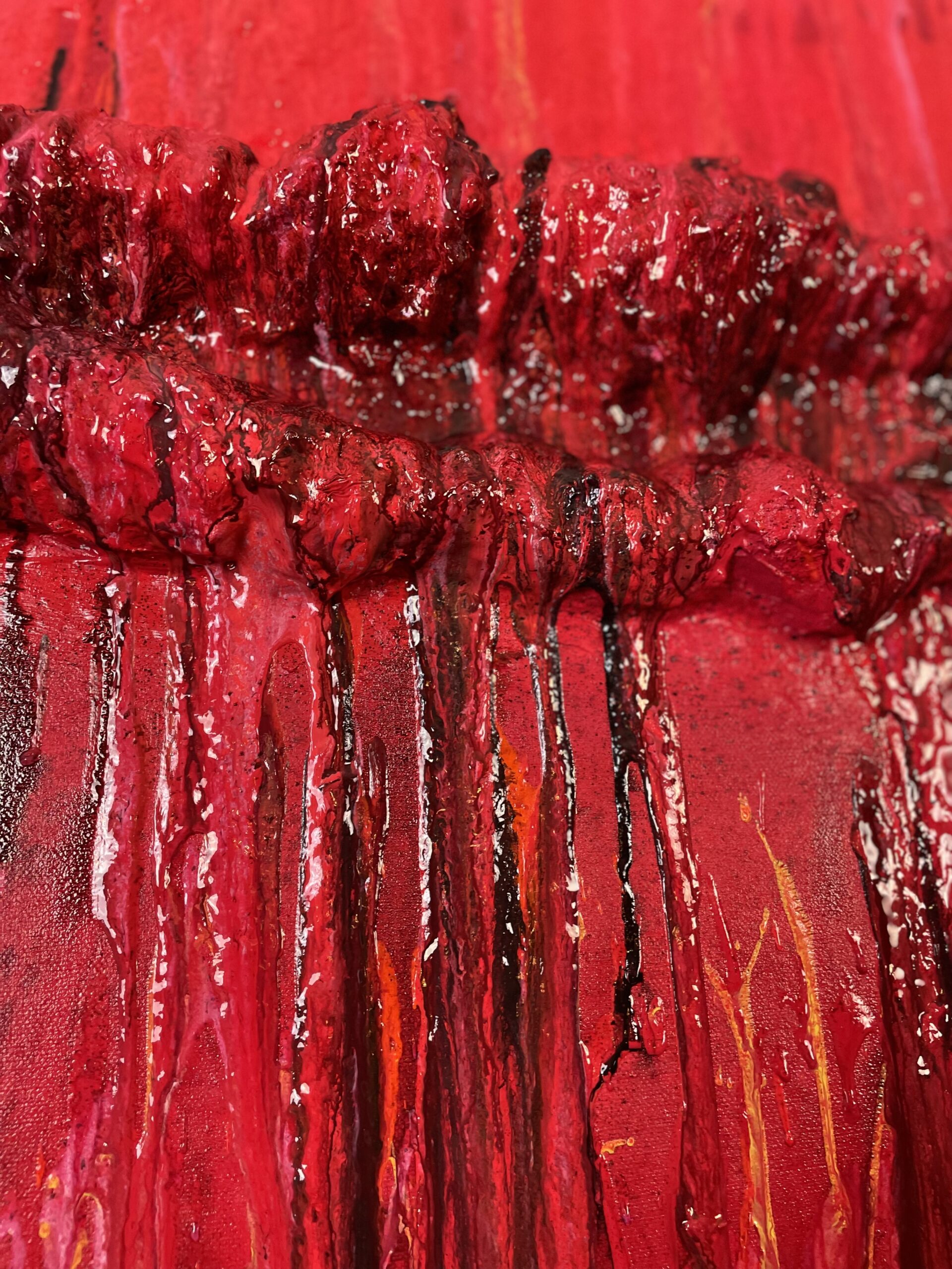 Abstraktes Originalgemälde in intensiven Rottönen mit strukturierter Oberfläche und fließenden Pouring-Spuren. „Der Riss II“ macht innere Spannung und Bruch als kraftvolle, visuelle Bewegung sichtbar.