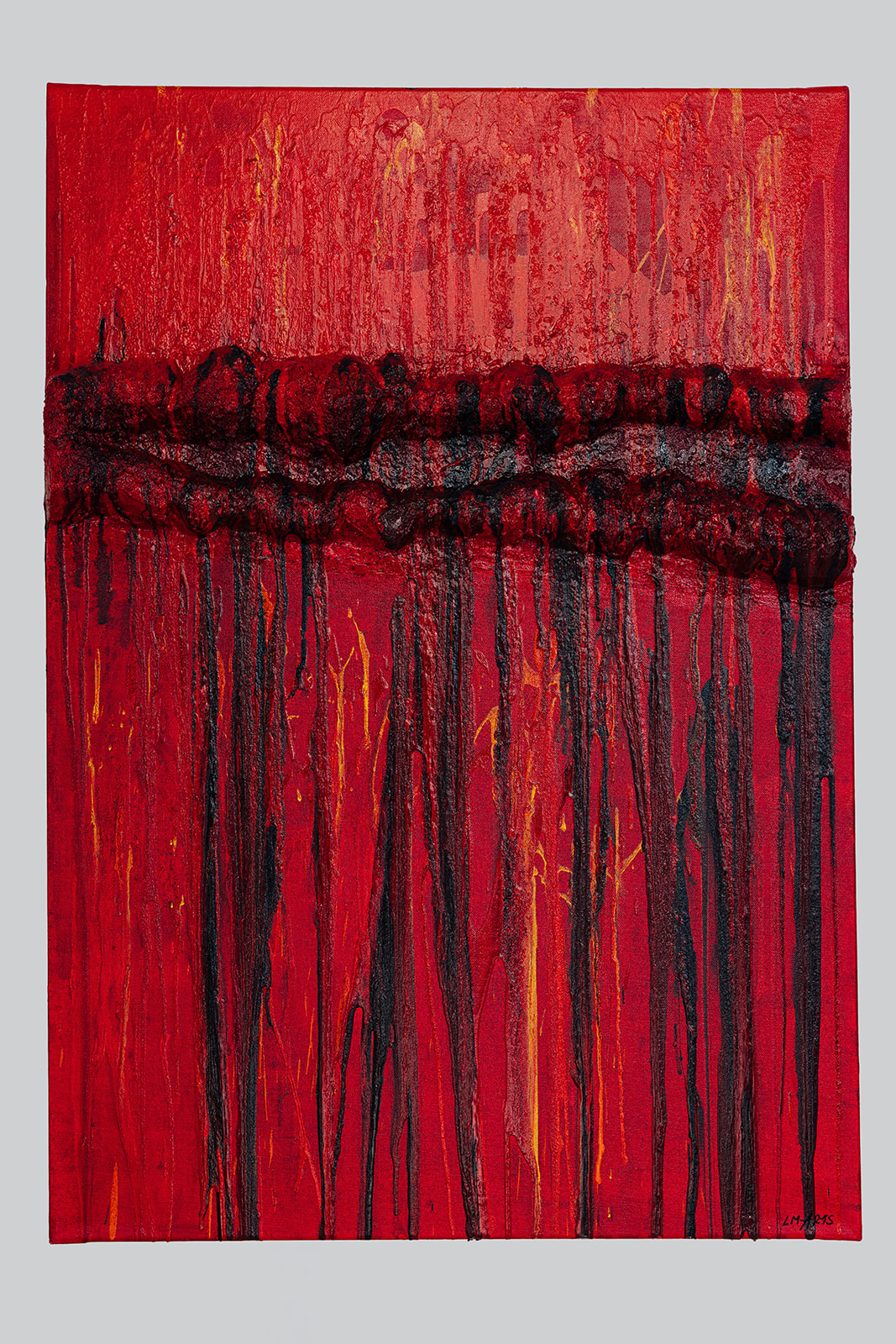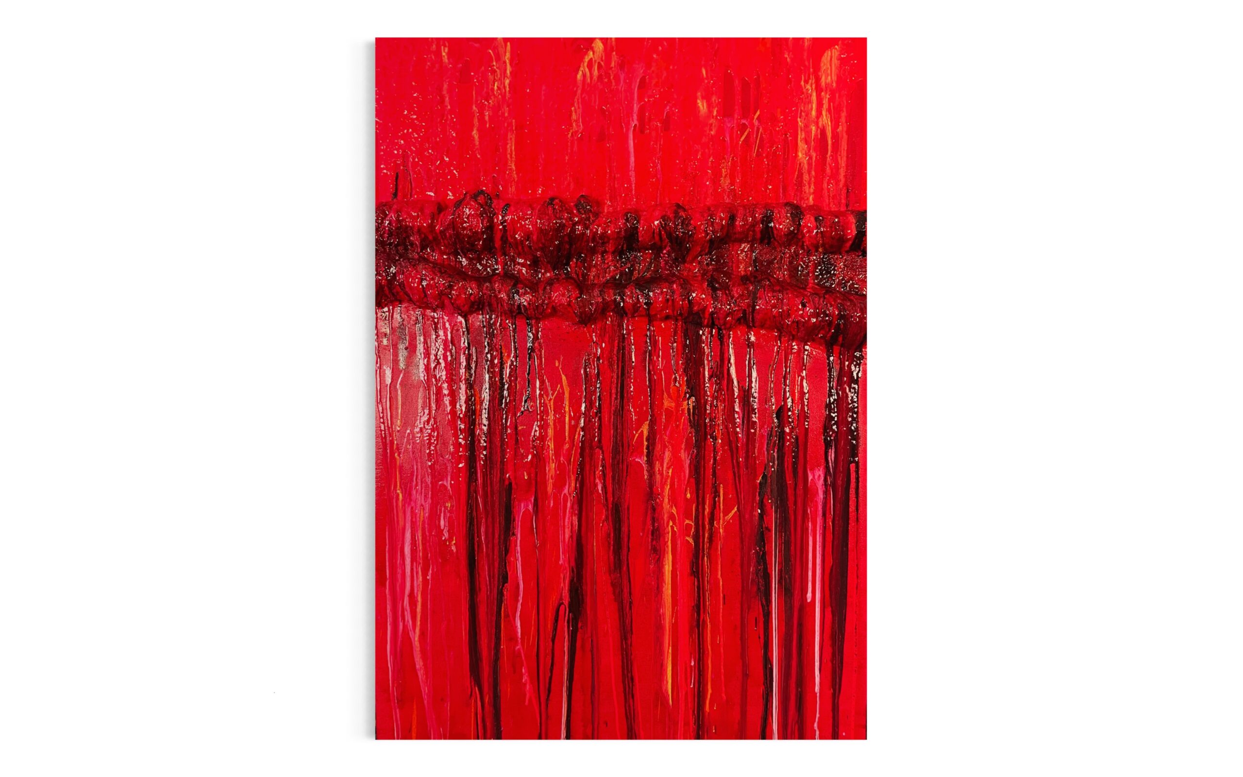 „Der Riss II - von Innen zerrissen“ ist ein großformatiges, abstraktes Originalgemälde, in dem sich Spannung nicht als plötzlicher Bruch zeigt, sondern als aufbauender Druck im Material. Die intensive rote Farbfläche wirkt zunächst geschlossen. Doch im oberen Bereich verdichtet sich das Material zu einer körperlichen, fast wulstartigen Form - wie eine Grenze, die sich nach außen drückt. Darunter beginnt die Bewegung. Farbe löst sich, läuft nach unten, zieht Spuren. Die vertikalen Linien entstehen nicht aus einem Schnitt, sondern aus einem Überlaufen. Was sich zuvor gestaut hat, entlädt sich sichtbar auf der Oberfläche. Das Werk wirkt direkt, körperlich und unmittelbar. Es zeigt keinen Moment der Zerstörung, sondern den Punkt, an dem etwas nicht mehr im Inneren gehalten werden kann.