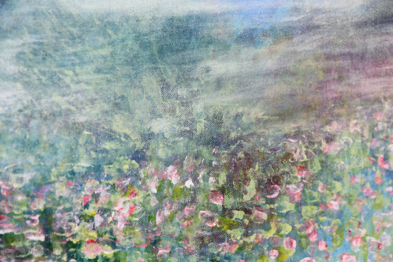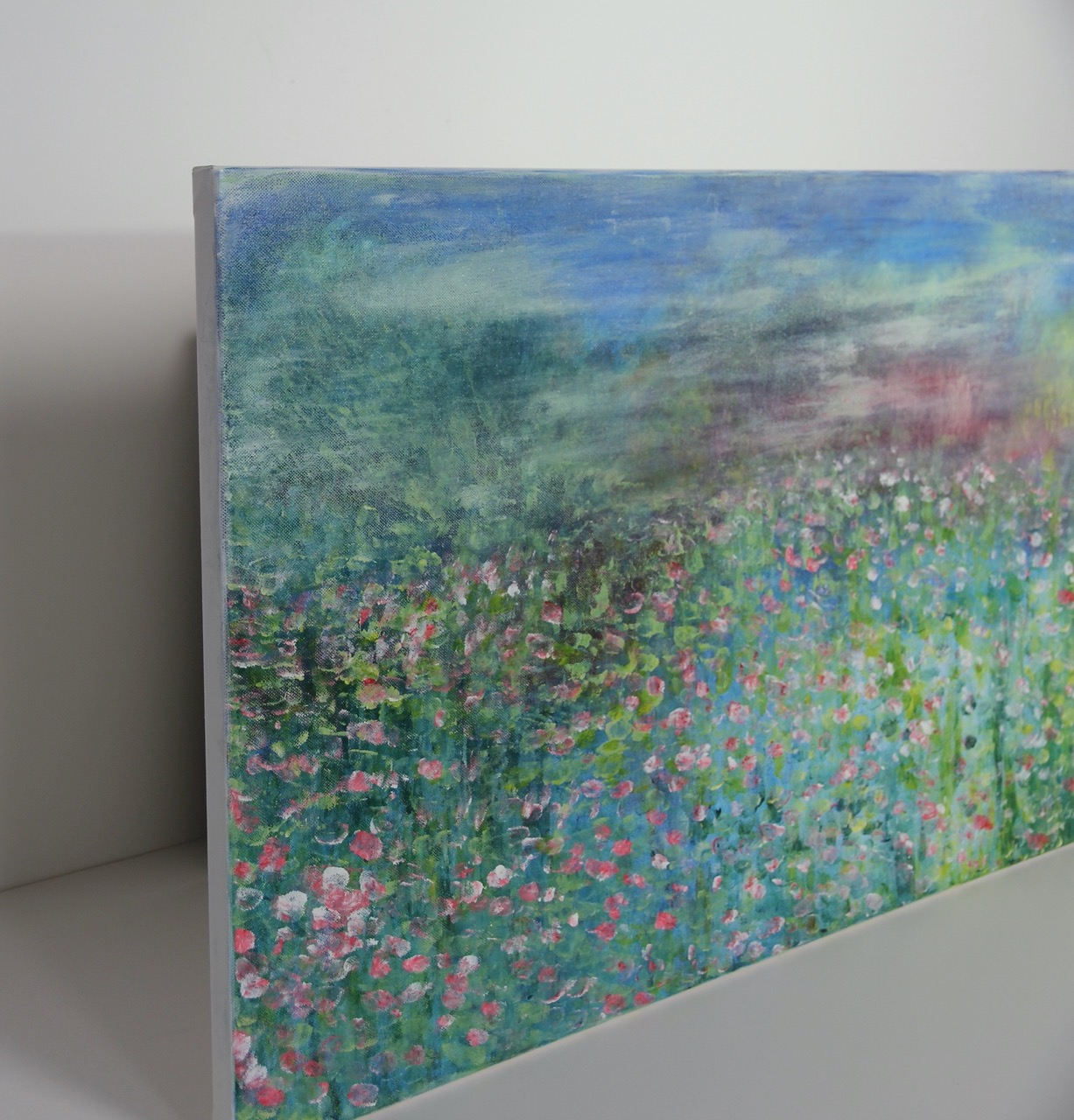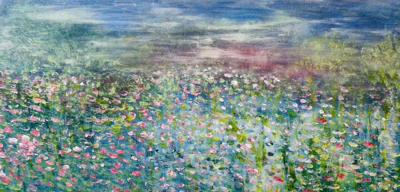 „ECHO des Frühlings“ ist ein großformatiges Acrylgemälde, das die Atmosphäre eines flüchtigen, lebendigen Moments sichtbar macht. Auf 50 x 100 cm entfaltet sich ein vielschichtiges Farbspiel aus Blau-, Grün- und Rosatönen, das an ein weites Blütenfeld erinnert, ohne konkret zu werden. Die Komposition lebt von Bewegung und Auflösung. Formen entstehen nur angedeutet und lösen sich wieder auf. Es entsteht ein Spannungsfeld zwischen Tiefe und Leichtigkeit, zwischen ruhiger Fläche und vibrierender Farbstruktur. Der obere Bereich öffnet den Raum mit kühlen, weiten Farbschichten, während sich darunter ein dichteres, florales Feld entwickelt. Die einzelnen Farbtupfer wirken wie Spuren eines Moments - direkt, intuitiv und nicht wiederholbar. Dieses Werk bewegt sich zwischen Abstraktion und Naturassoziation. Es geht nicht um Darstellung, sondern um Wahrnehmung und Atmosphäre.