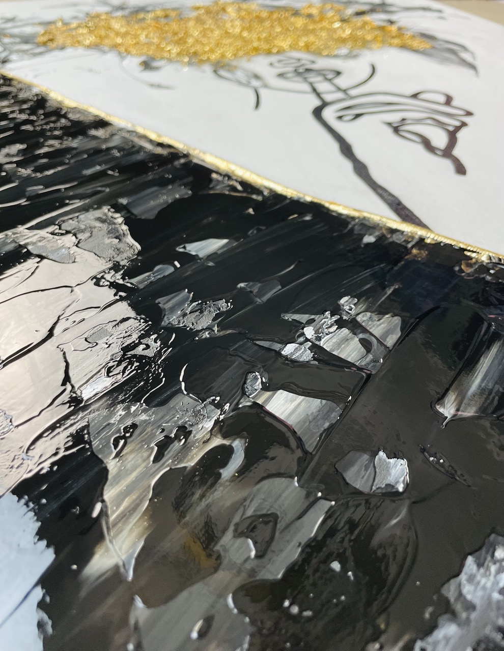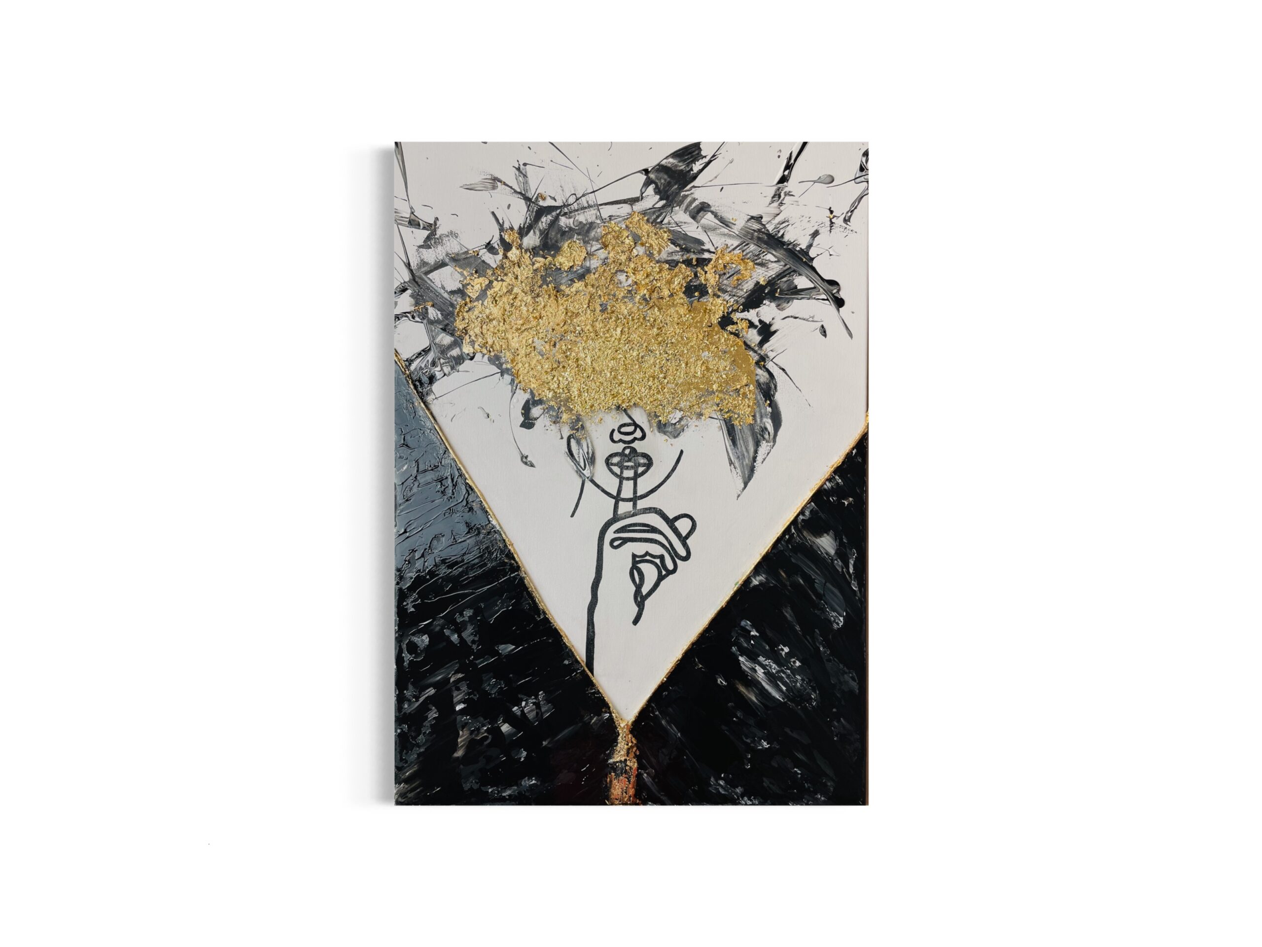 „Fokus“ ist ein Werk, das sich nicht erklärt, sondern bündelt. Die zentrale Figur ist nur angedeutet. Eine Linie, ein Gesicht, eine Geste. Der Finger vor den Lippen wirkt ruhig. Fast still. Doch darüber bricht etwas auf. Gold legt sich roh über den Kopfbereich. Nicht glatt, nicht kontrolliert - sondern bewusst unruhig. Gedanken, Impulse, Energie. Nicht geordnet, sondern sichtbar gemacht. Das goldene V-Element teilt die Fläche. Ein Bruch. Eine Kante. Eine Entscheidung. Es wirkt wie ein Schnitt durch das Bild oder wie ein Moment, in dem sich etwas öffnet. Das Werk bewegt sich genau in diesem Spannungsfeld - Zwischen Stille und innerem Lärm. Zwischen Kontrolle und Ausdruck. Zwischen „Nicht reden“ und maximaler Präsenz.