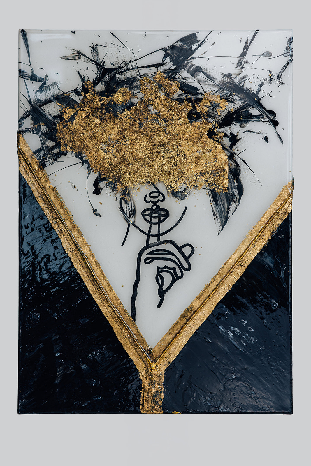 Das Werk kombiniert mehrere Ebenen und Materialien: Acrylfarbe, Strukturaufbau, Blattmetall und Epoxidharz. Dabei wird die Erwartung bewusst gebrochen. Das Epoxidharz erzeugt keine glatte Oberfläche. Im Gegenteil - Unebenheiten und Brüche bleiben sichtbar und gewollt. Das Blattmetall im Kopfbereich ist roh aufgetragen. Es reflektiert das Licht ungleichmäßig und verändert sich je nach Perspektive. Das goldene V-Element hebt sich haptisch vom Untergrund ab. Eine zusätzliche Ebene - physisch und visuell. Die Oberfläche lebt von diesen Gegensätzen - glatt vs. rau, kontrolliert vs. gebrochen.