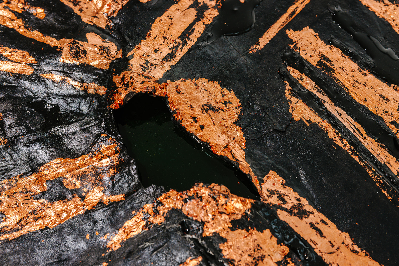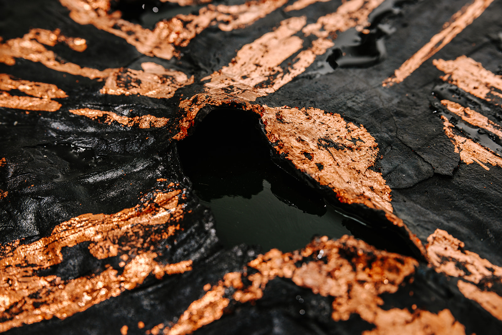 Ein materialbetontes, abstraktes Originalwerk, das aus einem ruhigen Zentrum heraus wirkt. Schwarz und Bronze treffen aufeinander, bilden Tiefe, Spannung und eine stille, fast meditative Präsenz.