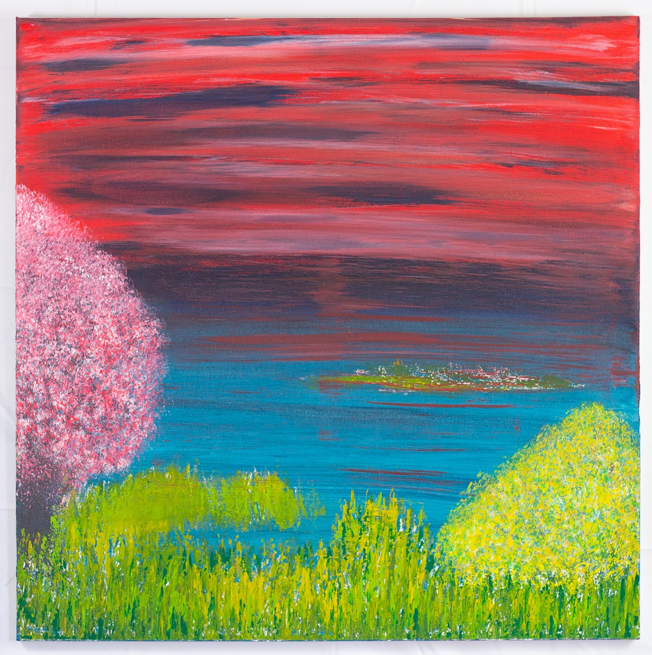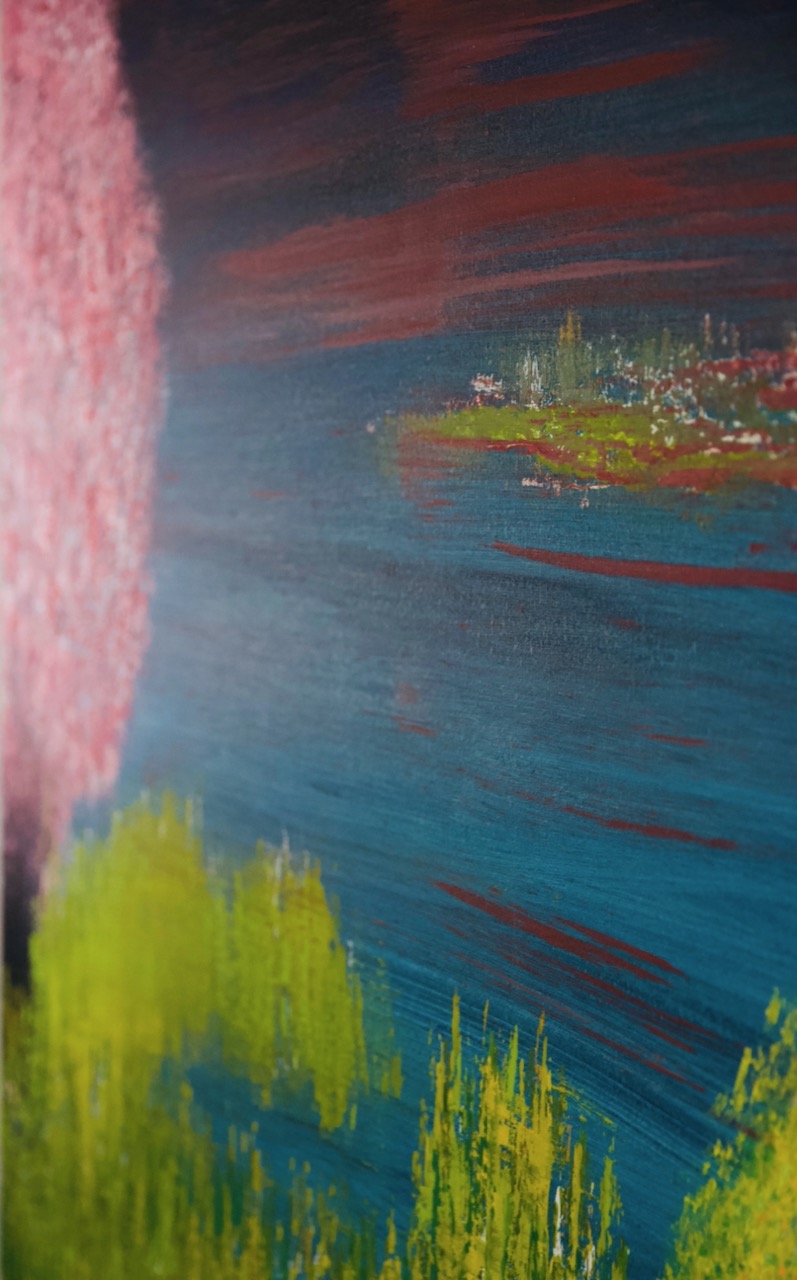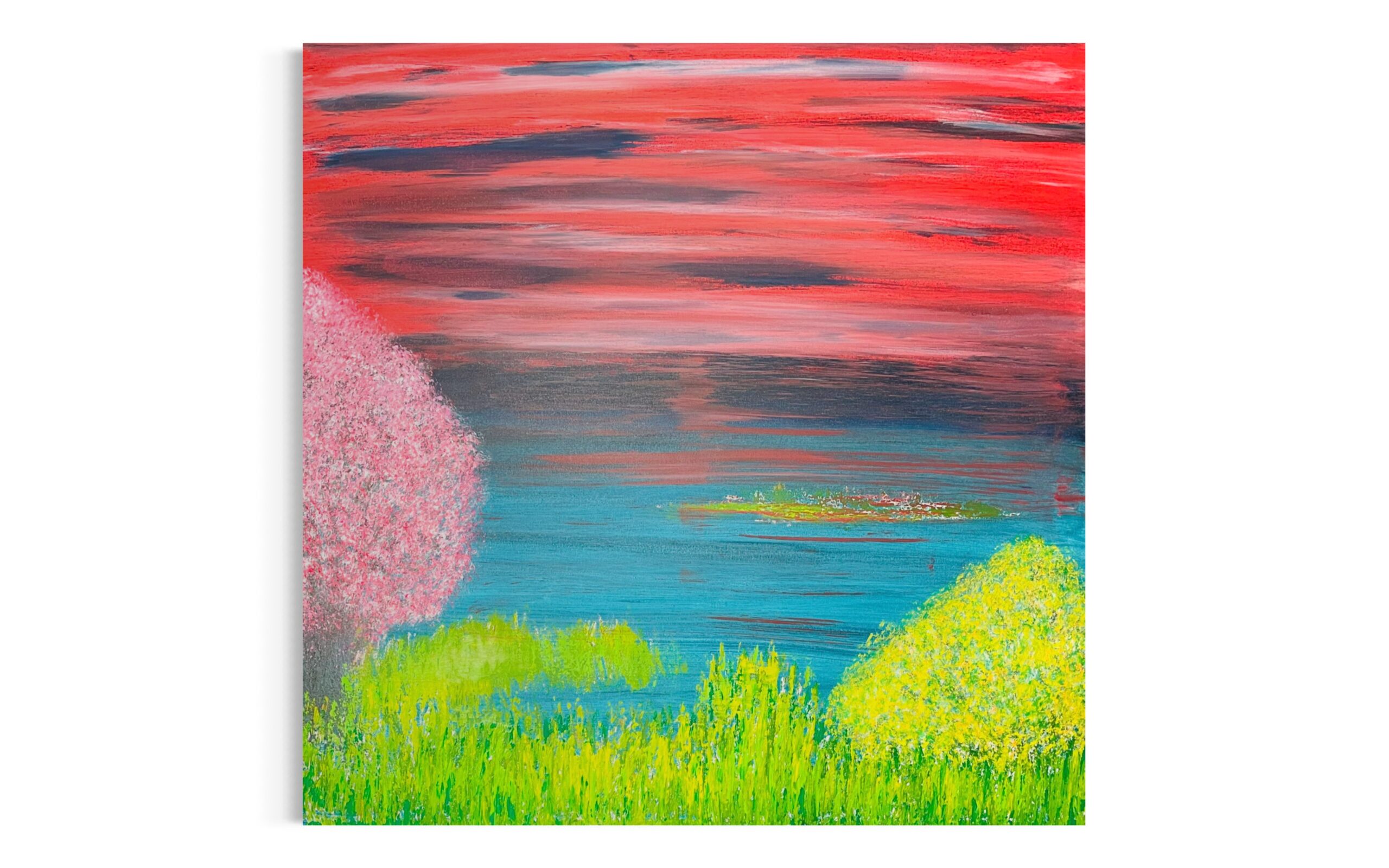 „Unfertige Hoffnung“ zeigt keinen Zustand der Ruhe. Es zeigt den Moment danach. Der Vordergrund wirkt lebendig und offen - fast wachsend. Grün- und Gelbtöne stehen für Bewegung und Möglichkeit. Dazwischen liegt eine Wasserfläche. Sie trennt. Sie hält Abstand. In der Ferne erscheint eine kleine Insel. Sie ist sichtbar, aber nicht erreichbar. Darüber spannt sich ein Himmel in Rot- und Violetttönen. Er wirkt nicht warm, sondern geladen. Fast schwer. Das Bild löst nichts auf. Es bleibt im Zustand des Wartens.