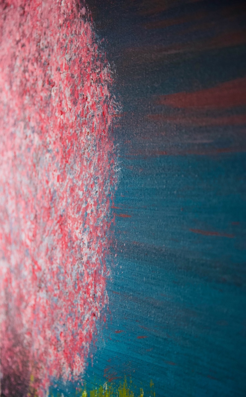 Acrylfarbe wird in Wisch- und Spachteltechnik aufgetragen. Die Oberfläche bleibt bewusst unruhig. Strukturen sind sichtbar und Teil der Aussage. Im Vordergrund wirkt die Oberfläche lebendig und fast taktil. Im Himmel entstehen Schichten, die Spannung aufbauen statt sie zu glätten. Das seidenglänzende Finish verstärkt die Tiefe und verändert die Wirkung je nach Licht.