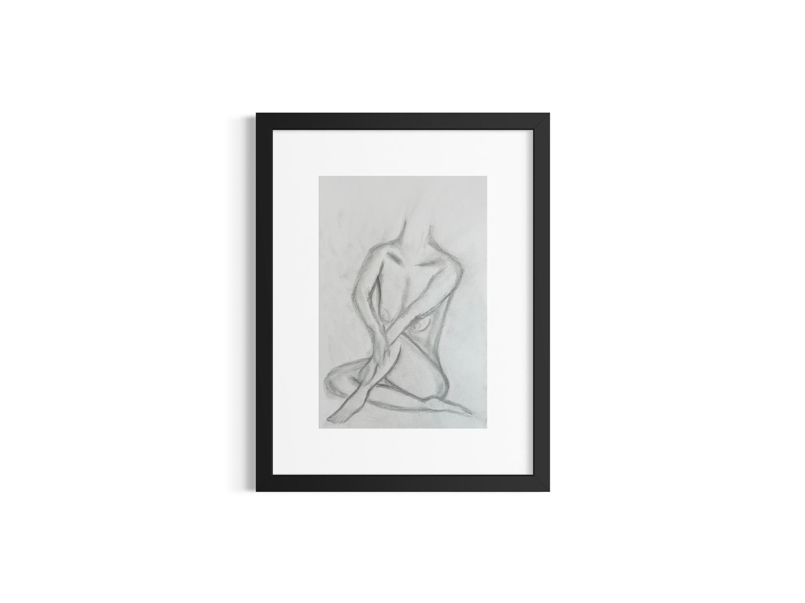 Die Zeichnung ist Teil der Serie „Körperpoesie“, in der der menschliche Körper auf reduzierte Formen und innere Zustände zurückgeführt wird. Im Mittelpunkt steht nicht die anatomische Genauigkeit, sondern das Spannungsfeld zwischen Haltung, Fragment und Wahrnehmung. „In sich gehalten“ zeigt eine Figur, die sich nicht öffnet, sondern in sich bleibt - präsent und zugleich zurückgenommen.