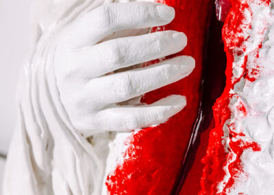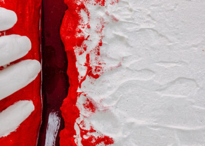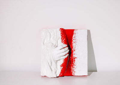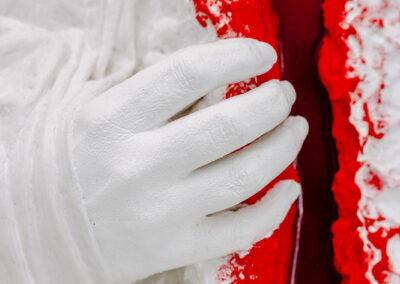 Das Hochrelief „AUFBRECHEN“ ist nicht nur Kunst, sondern stellt auch eine körperliche Metapher für Transformation dar. LadyMARIANN-Arts nutzt hier die Leinwand als skulpturalen Träger, um einen dramatischen Riss in der Realität darzustellen. Durch die extreme Tiefe des Werkes von bis zu 8 cm entsteht eine monumentale Wirkung. Die haptische Faktur, das gegensätzliche Spiel von Gips und Stoff bildet hier einen Schutzpanzer, aus dem die reine weiße Hand als Symbol der Autonomie und des Mutes hervorbricht.