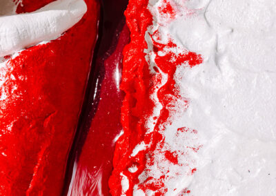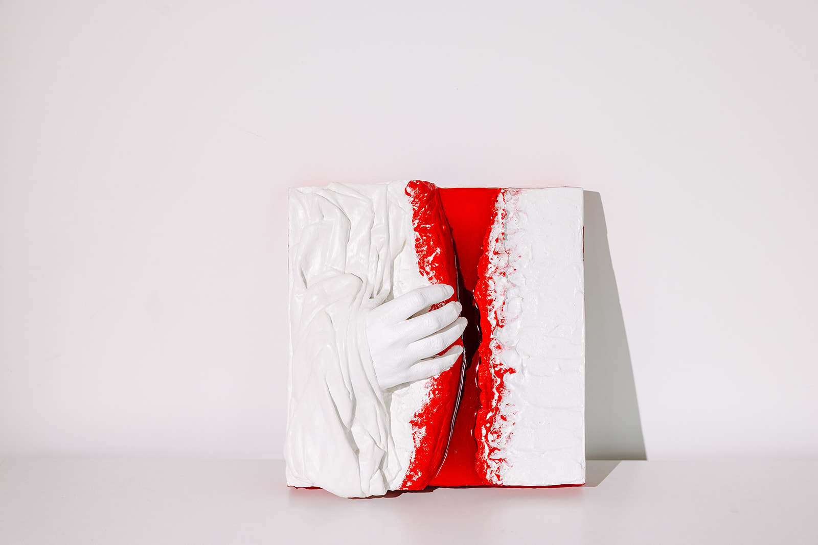 Der Kontrast zwischen dem reinen Weiß und dem viszeralen, durch Resin versiegelten Rot ist ein psychologisches Kraftfeld. Das glänzende Rot signalisiert ungefilterte Lebenskraft, die nach außen drängt, während die weiße Hand diesen Moment zwischen Schutz und Freilegung navigiert.